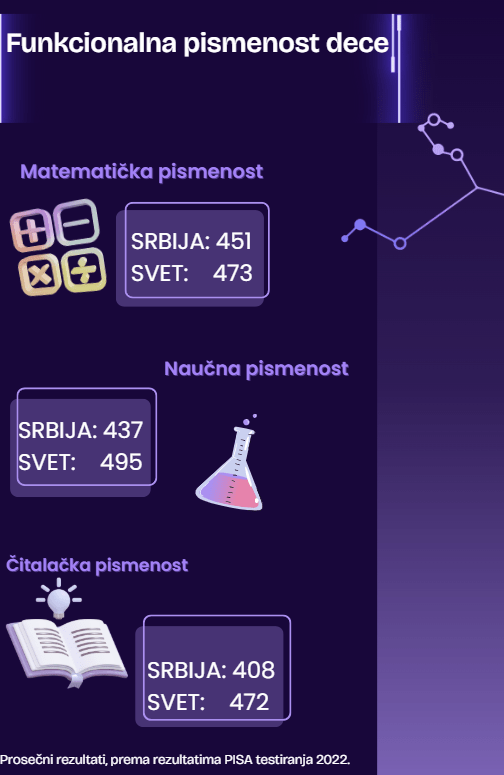 15-godišnjaci u našoj zemlji zaostaju od svetskog proseka – kako u matematičkoj i naučnoj, tako i u čitalačkoj pismenosti, sudeći po rezultatima PISA testova obavljenih do 2022. godine. U proteklih 10 godina, ishodi učenja dece kontinuirano su niži od svetskog proseka. Takva stagnacija ukazuje na potpuno odsustvo strateških promena, a enorman jaz koji se javlja u rezultatima učenika iz manje razvijenih sredina ukazuje i na veoma prisutnu socijalnu nejednakost u oblasti obrazovanja.